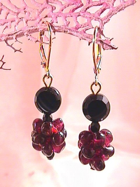 A round cluster of delicate garnet beads create big impact when paired with the faceted black coin bead. Earrings have gold-plated lever wires. 1 3/4"L.